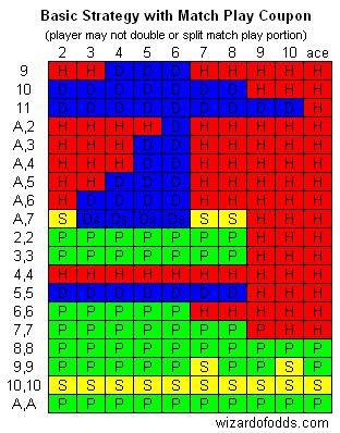 這取決於玩家是否被允許加倍或分牌投注的比洞賽部分。通常情況下,玩家不允許這樣做,這對玩家不利。下表顯示如何調整你的加倍和分牌策略,假設玩家不能加倍比洞賽部分,並且如果玩家分牌,則比洞賽部分將保留,基於無限牌堆和莊家在軟17點停牌的情況。要牌/停牌策略相同。