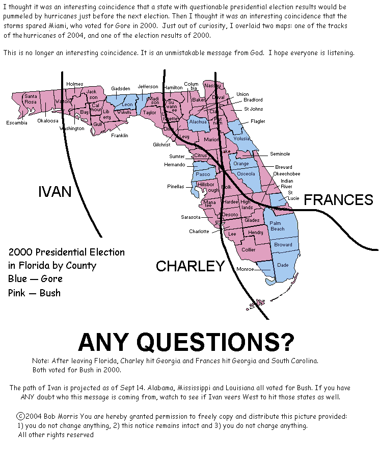 您如何看待以下的說法:上帝是民主黨人,因為 2000 年投票支持戈爾的所有縣都沒有受到最近襲擊佛羅裡達州的三次颶風的影響?