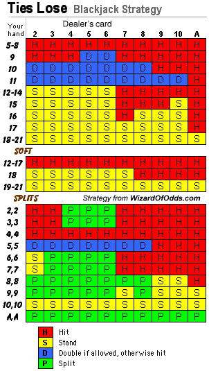 聖經裡不是有一條戒律禁止偷竊嗎?我算了一下,這個遊戲的莊家優勢是9.3%(哎喲!)。以下是針對這種「平局輸掉二十一點」變體的適用基本策略。請參閱第110欄,了解玩家在軟牌上可以加倍的版本。