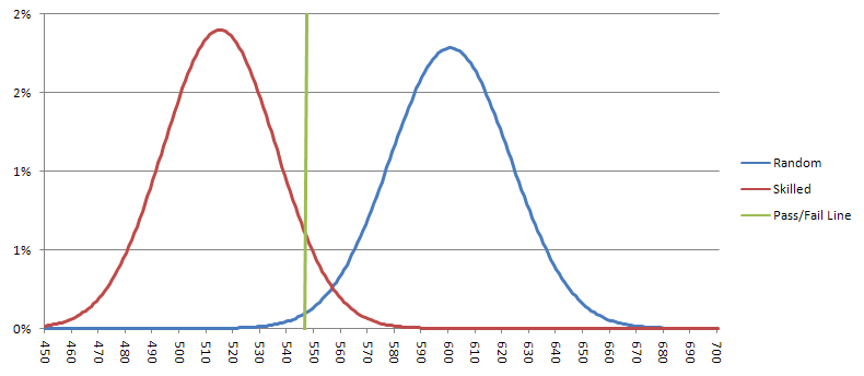 一位七分之一的射手平均應該可以打出514.3個七分,標準差為21.00。使用高斯近似,這位技術嫻熟的射手投出548個或更多七分(假陰性)的機率為5.7%。一位隨機射手平均應該可以打出600個七分,標準差為22.36。一位隨機射手通過測試(假陽性)的機率為0.94%。下圖顯示了技術嫻熟和隨機射手的可能結果。如果結果在綠線左側,那麼我認為該射手通過了測試,我會押注他獲勝。