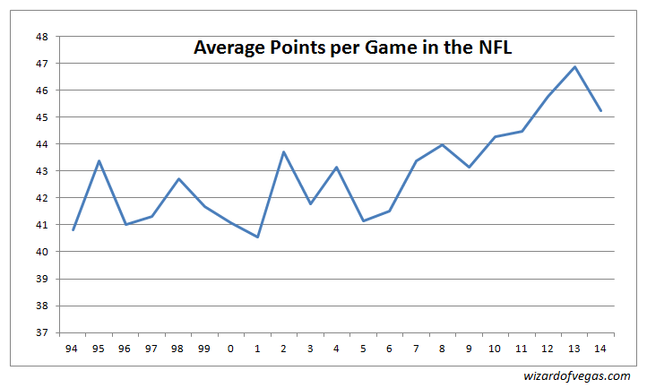 首先,我們應該擔心,但這也必然是因為這個原因。其他規則的改變削弱了防守的侵略性,導致比賽得分更高。下圖顯示了1994年至2014年每個賽季的場均得分。