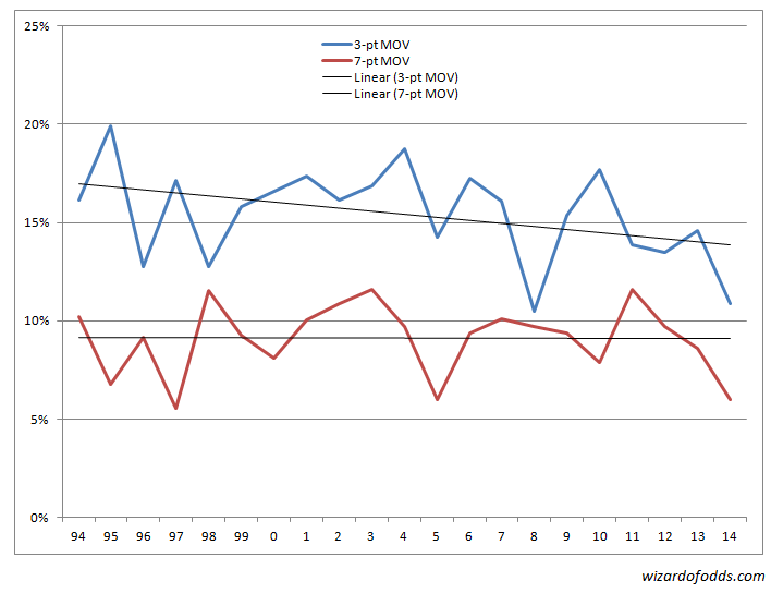 如你所見,7分淨勝的機率穩定在9.1%。然而,3分淨勝的機率一直在穩定下降,尤其是自2004年以來。這很糟糕,因為NFL中3分淨勝的情況非常普遍。