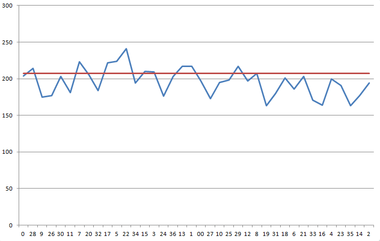 下圖按順序顯示了您在輪盤上的結果。藍線表示您的結果。紅線表示您需要的數字 207.11,以克服 5.26% 的賭場優勢。