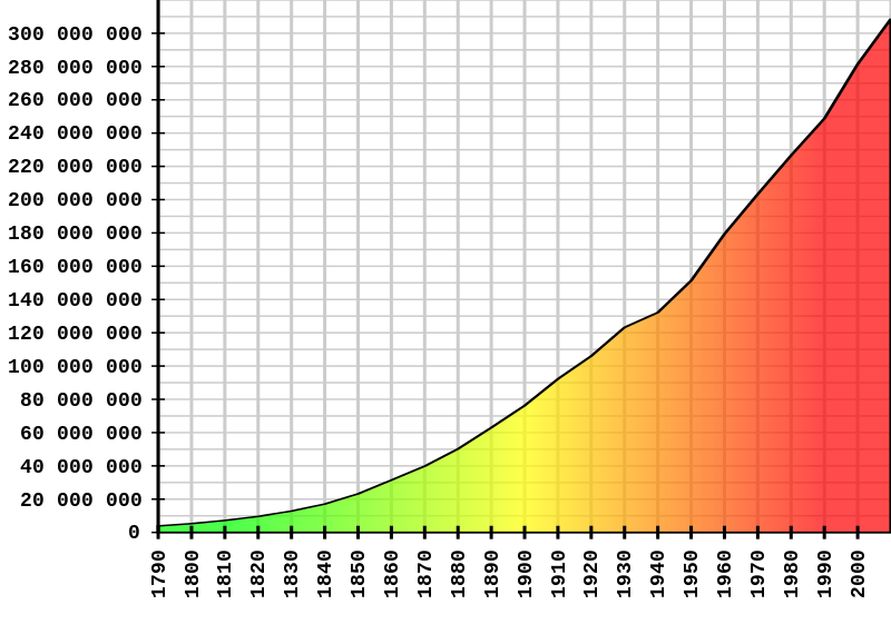 然而,人口並不穩定。從這張圖表來看,美國人口每十年增加10.71%,相當於每年1.02%。為了簡單起見,我們就假設是1%吧。