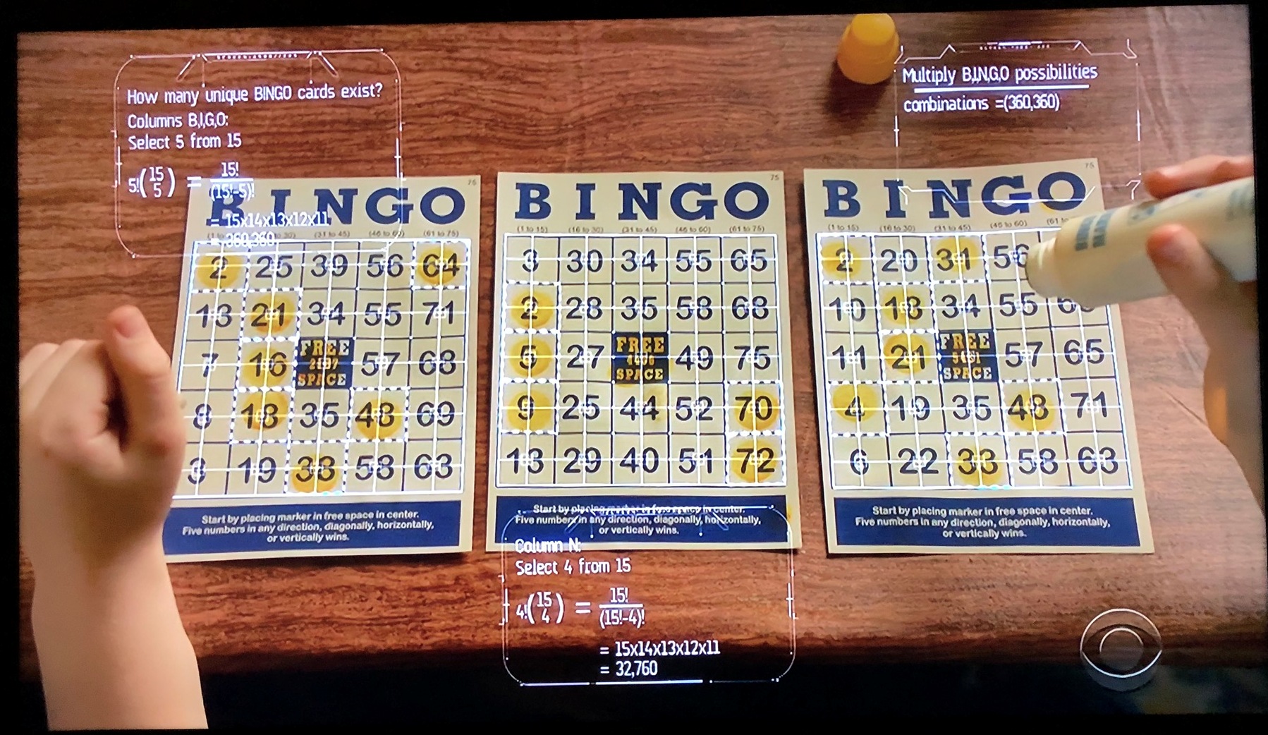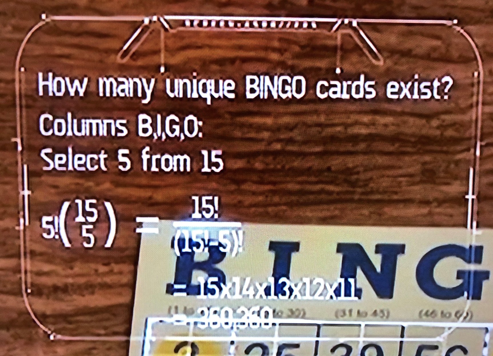 在《少年謝爾頓》第三季第四集《哈比人、物理學和拉鍊球》中,謝爾頓問自己一張賓果卡上可能的組合數。答案是什麼?節目中顯示的公式正確嗎?