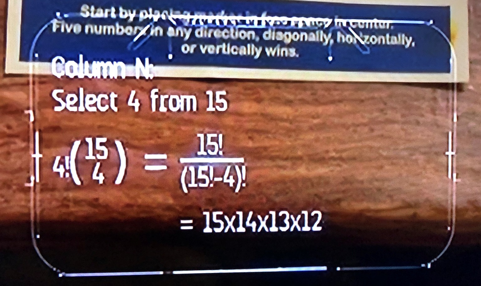 首先,我來介紹一下排列數。這意味著不僅數字重要,它們在卡片上的順序也很重要。對於 B、I、G 和 O 列,可能的排列數為 permut(15,5) = 15!/(15-5)! = 15*14*13*12*11 = 360,360。對於 N 列,排列數為 permut(14,4) = 15!/(15-4)! = 15*14*13*12 = 32,760。因此,賓果卡的總排列數為 360,360 (4 × 32,760) = 552446474061128648601600000。
