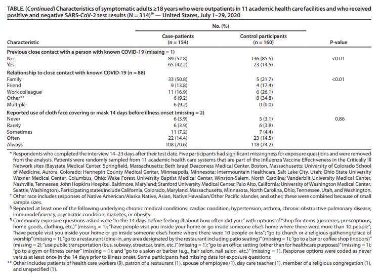 85% 指的是美國疾病管制與預防中心 (CDC) 發布的《美國 11 家門診醫療機構中 18 歲以上有症狀成年人與 COVID-19 相關的社區和密切接觸暴露情況報告》(2020 年 7 月)第 4 頁的表格。表格如下。