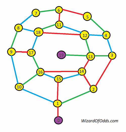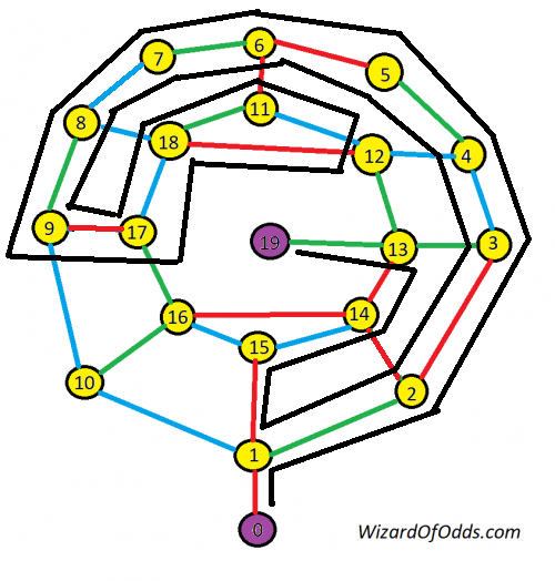 你的任務是從0號方格走到19號方格。你不能連續兩次走同一種顏色的路徑。換句話說,你必須在每個方格換一條顏色不同的路徑。不能掉頭。答案是什麼?
