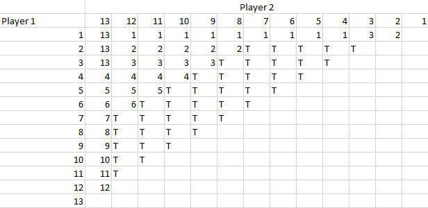 n 位玩家總共進行 n*(n-1)/2 局遊戲,其中各與其他玩家各玩一次。每局遊戲產生 1 分,這也是所有玩家獲得的總分。