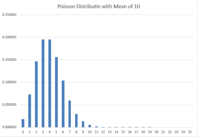 我選擇泊松假設的原因是,當平均值足夠大時,它遵循近似鐘形曲線的形狀,並且實際結果永遠不會低於零。
