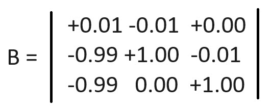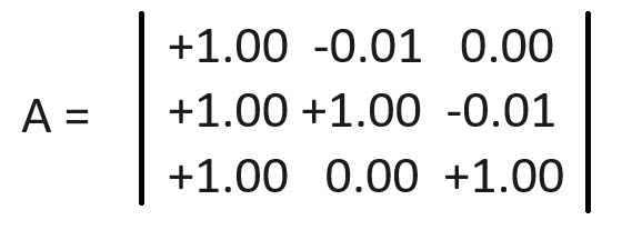 無需贅述,解可以表示為 determ(A)/determ(B)。矩陣中的項取自上述三個方程式。