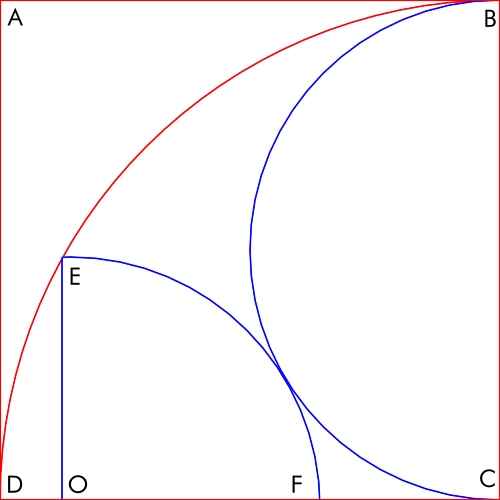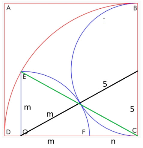 如圖所示,ABCD 為邊長為 10 的正方形。在其內部分別內切了一個半圓和一個四分之一圓。