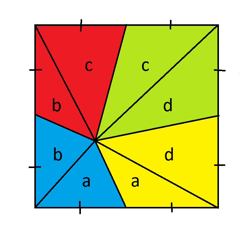 首先,從四個圖形的交點分別向四個角落畫四條線。然後如下標記這八個圖形。