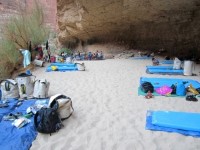OARS 提供每位客人 50 美元的睡眠包。我注意到其他客人都選擇了這個選項。我本來打算給 Aidan 和我自己帶睡眠包,但出發前幾天,OARS 的人說我們最後一天用來拖運裝備的騾子已經訂滿了,問我是否介意第二天把多餘的裝備拖過來寄給我。作為回報,他們允許我們免費使用兩套睡眠包。反正旅行結束後一段時間內我也用不著這些裝備,所以我就答應了。睡眠套裝包括睡袋、床單和枕頭。他們還給了我們一個充氣睡墊,是預充過的。晚上太暖和了,一開始我只是睡在睡袋上,床單下。然而,到了凌晨兩點左右,我就會覺得冷,就鑽進睡袋裡。