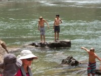 第一天我們遇到的幾個急流都比較平緩。像我和兒子這樣的初學者,在逐漸適應急流之後,也逐漸適應了。為了緩解長時間平靜水流帶來的衝擊,工作人員買了一些大注射器,用來打水仗。工作人員也鼓勵大家跳出筏子涼快一下。