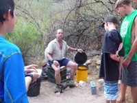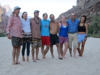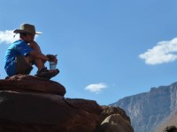第六天一大早,阿曼達就去營地把大家叫醒了,早上五點就醒了。那一晚真是輾轉反側。半夜時分,我兒子抱怨說,感覺渾身都像是被蟲子咬了一樣,儘管他身上沒有任何蟲子,他還把水灑在了我第二天要穿的乾衣服上。我不知道他當時是睡得怎麼樣,就發生了這一切。五點鐘,我趕緊叫醒艾丹,收拾好行李,幾分鐘內狼吞虎嚥地吃下盡可能多的燕麥粥。然後我們乘船短途前往幻影牧場下游的派普溪(Pipe Creek)。我聽說他們通常會把客人送到幻影牧場,但阿曼達想縮短健行時間,這次下山就縮短了兩英里。我兒子很失望我們錯過了幻影牧場,因為他在學校讀過一本關於幻影牧場的書,非常感興趣,尤其是對據說棲息在那裡的隱形蝎子。不過,我們有理由再來一次。