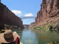 第一個值得一看的地方是納瓦荷橋,我們剛開車過去,現在正漂浮在橋下。橋高出河面470英尺(約143公尺)。我們原本就身處峽谷之中,雖然五天後我們到達幻影牧場時,橋緣的高度比現在高出十倍。