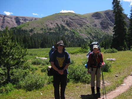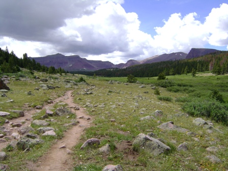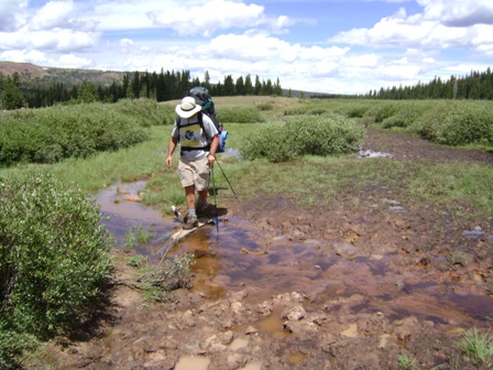 過河後,小路穿過幾條長長的草木茂盛的排水溝。同時,山勢漸高,樹木漸矮。在我看來,這是健行中最美的一段風景。然而,穿越排水溝的代價是,有些路段泥濘不堪,我費力地把腳從泥裡拔出來,差點把靴子拔出來。在前往美元湖的途中,我們遇到了至少100名迎面而來的健行者。幾乎所有人都看起來二十出頭,很多人手上都拿著釣竿。我擔心美元湖地區會因為路上人潮太多而變得擁擠不堪。