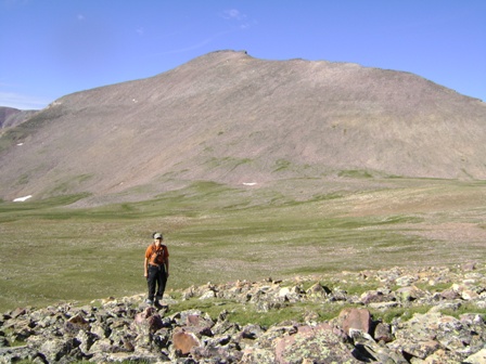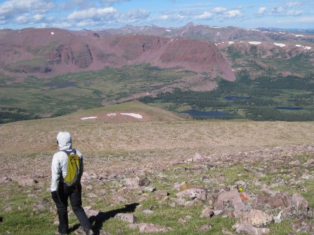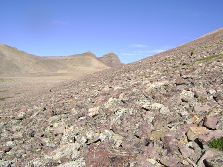 回車的路上。我和賈斯汀後面是通往吉伯特峰的第一道障礙。下山時,我們記不清上山的路線了。我和賈斯汀沿著照片左側那條長長的、容易的路走了下來。喬爾和哈蘭則沿著賈斯汀頭頂上方陡峭的路往下走。
