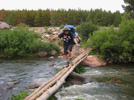 第二天早上,我們出發前往美元湖畔的下一個露營地。這一天很輕鬆,行程約八英里,海拔上升約1000英尺。小徑始於高大的松樹林,沿著亨利福克河蜿蜒而行。大約三英里後,我們來到一座被沖毀的橋邊,他必須從這裡過河。在我們之前,有人把三根細木綁在一起,我們勇敢地跨了過去。實際上,我可能是唯一一個感到緊張的人。其他人走過去的速度幾乎與平常一樣慢,就像在走一條六英尺寬的人行道一樣。