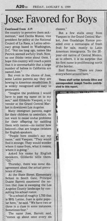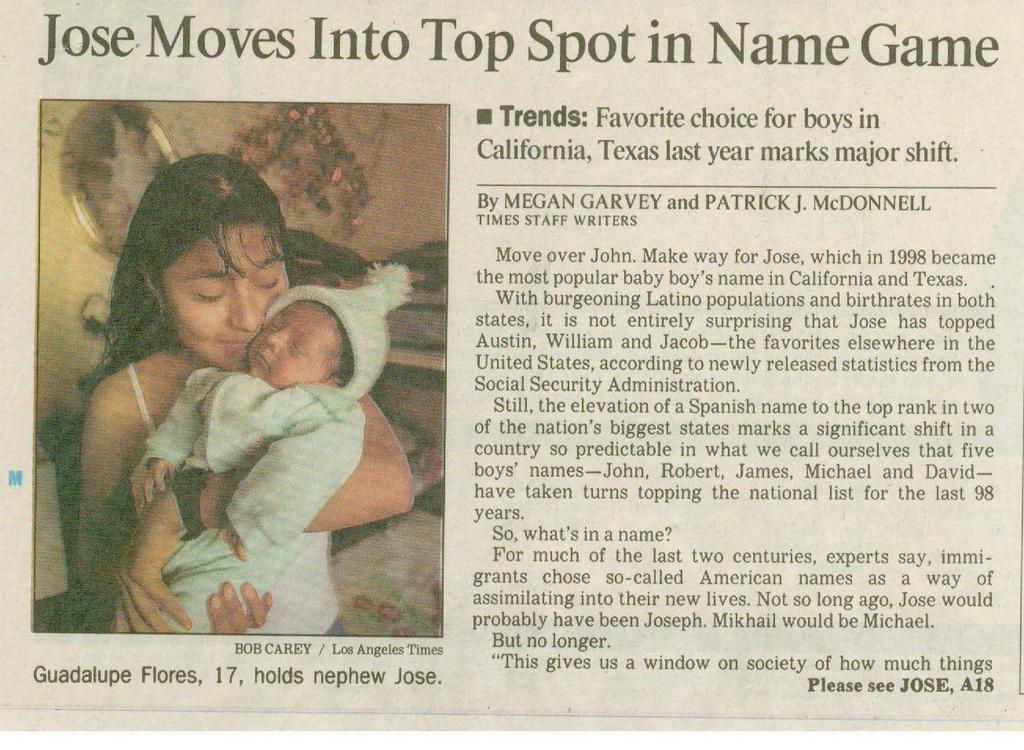 這真是太好了,我捨不得私藏;我以為全國人民都會想看的。巧的是,當時網路正流行起來。我已經很懂HTML了,而且還有一個現在停用的主頁。於是,我創建了一些簡單的熱門名字列表,並稱之為「麥克寶寶名字頁面」。我毫不費力地,這個頁面就火了,報紙雜誌也常引用我的名字。 1999年1月8日,我的名字出現在《洛杉磯時報》的頭版頭條新聞中,標題是“何塞在名字遊戲中佔據榜首”,報道了我發現1998年加州出生的男孩中最受歡迎的名字是何塞。彼得詹寧斯也在當晚的新聞中提到了這一點。