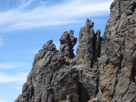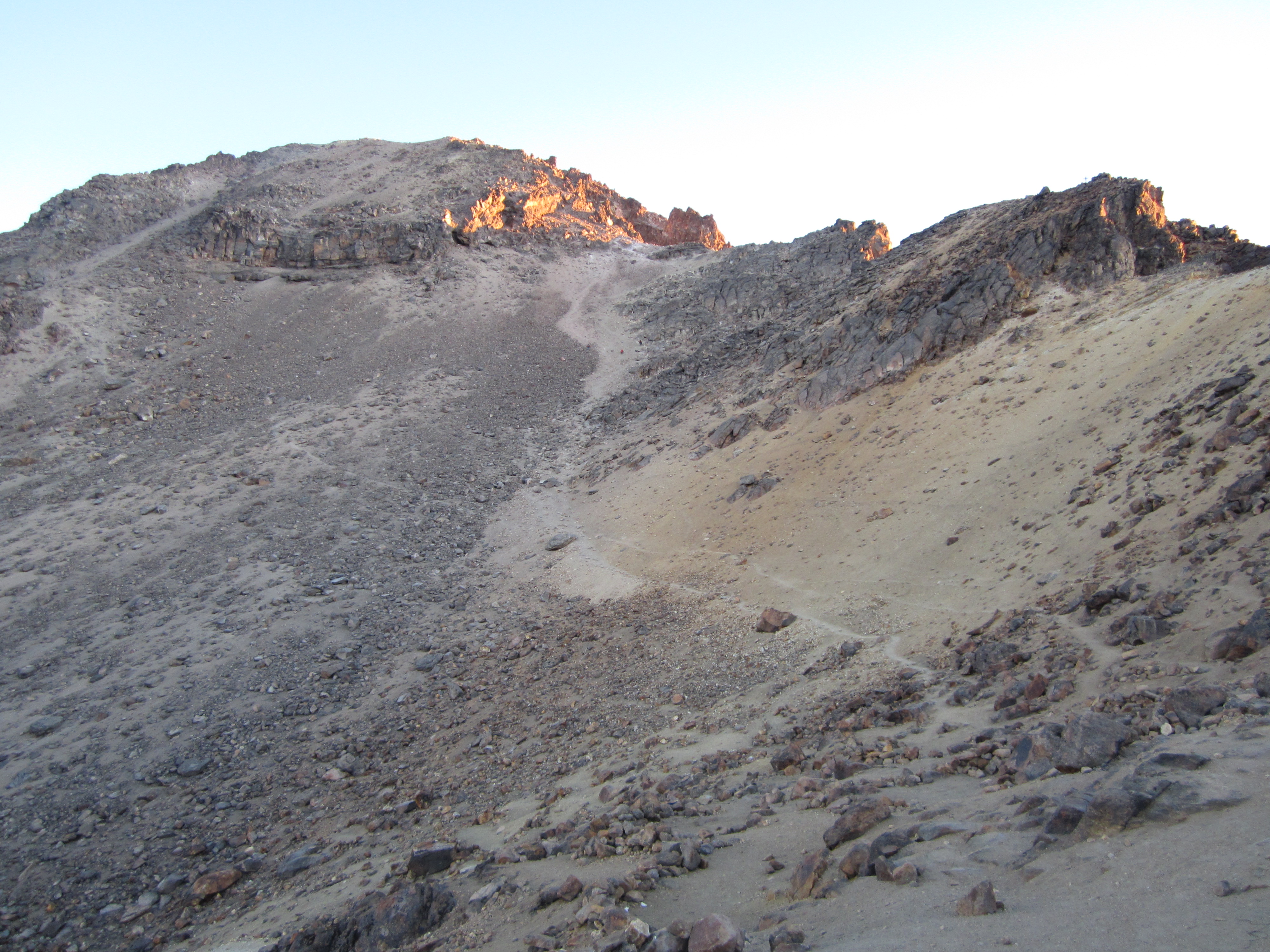 休息的時間比預想的要長得多,我們又繼續攀登。過了小屋,原本的小路變成了一條路線。我走在最前面,跟著其他登山客往上走。顯然,還有幾十個登山者比我們起步晚,卻沒有在小屋裡小憩。下一個重要的點是熟睡女子的膝蓋。我們在這裡稍事休息。我記得蘇珊當時就說,考慮到在小屋休息的時間太長,而且她速度較慢,她不可能在回程截止日期前登頂。她非常友善地為團隊做了讓步,說我可以跟著嚮導繼續前進,她會按照自己的節奏慢慢走,下山時會在某個地方和我們會合。