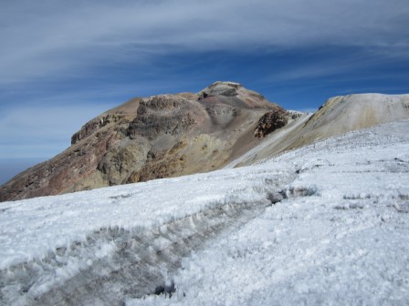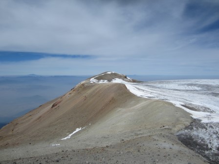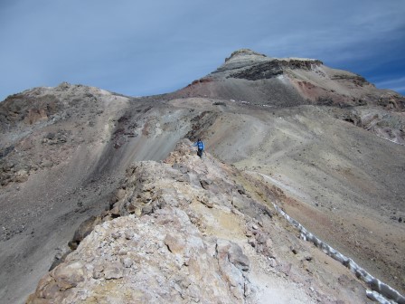 穿越冰原很有趣。然後我們又上山,沿著另一條山脊線走了一段。後來,我們來到了另一個冰原。冰原周圍有三個高點,包括我們站著的那個。這時大約是上午 11:15,差不多是我們應該登頂的時間了。然而,我們是不是在山頂,也就是所謂的「pecho」(沉睡女人的乳房)呢?我不確定。