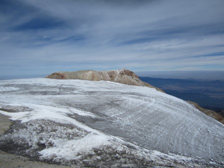 唯一標記我們位置的人造物是一隻神眼和一個茶壺。冰原對面的某個地方有兩三個十字架。然而,這座山上到處都是十字架,所以這並不一定意味著什麼。第三個點,不用觸冰就能到達,上面沒有任何人造物。看到山頂上立著旗幟、測量標記或登記冊來標記最高點,拍出更好的山頂照片,總是令人欣慰的。請原諒我的刻板印象,但墨西哥人通常不會羞於裝飾和紀念任何東西。不知為何,我們站的地方感覺不像山頂。