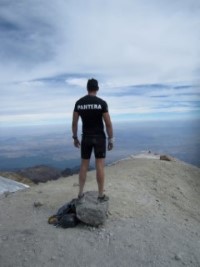 於是,我從背包底部掏出冰爪,把它們固定在靴子上。自從爬過雷尼爾山之後,我就沒再這樣做過,現在我還是記不住哪個是左邊哪個是右邊。我正要穿上冰爪,這時又來了一位嚮導,帶著一位客人。他看起來知識淵博,身強力壯,於是我問他哪個點是頂峰。他和客人都穿著滿滿的裝備,我沒認出他來。原來,他是前一天救了我們一命的阿爾佐莫尼小屋的嚮導帕布羅。