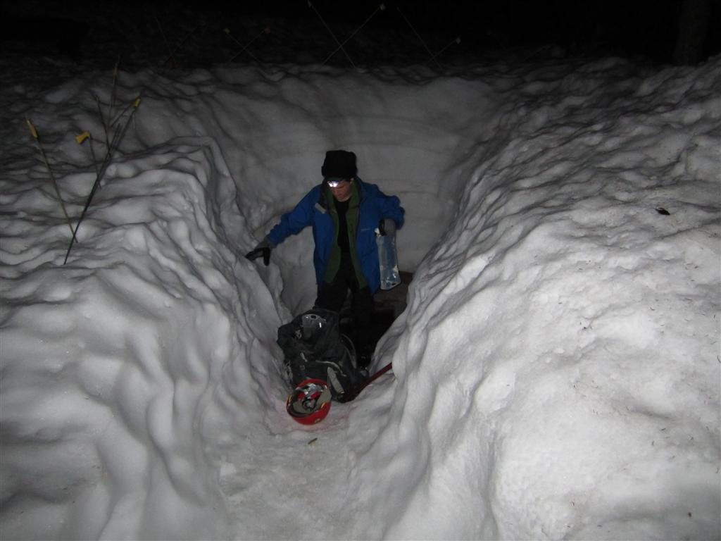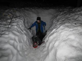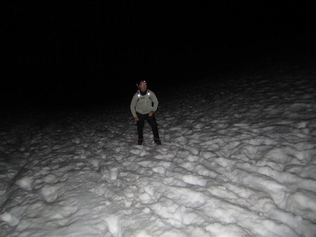到了約定的時間,我們收拾好行裝,穿上幾層防寒服,在黑暗中出發了。月亮還要兩個小時左右才會升起,而且路上也沒有任何標記。我們對路線的了解都是透過書籍和網路上的報導獲得的。 「我們」主要指的是艾瑞克,他事先做了最多的功課。然而,在深夜的冰雪和樹木中,這樣的功課幫助不大。我們集體決定該往哪條路走,基本上就是跟著之前登山者在雪地上留下的腳印走。一開始還好,但漸漸地,腳印變得稀疏,消失在一片堅硬的雪地裡。