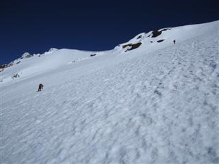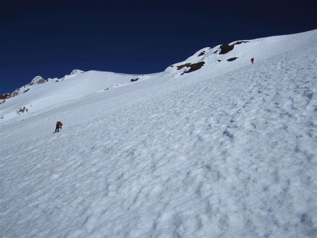六月底的沙斯塔山通常只有部分地區被冰雪覆蓋;然而,2011年冬天,美國西部山區的降雪量遠超平均。因此,這條路線幾乎完全被冰雪覆蓋。大雪其實是件好事,因為如果不這麼做,就只能在鬆散的碎石上徒步,這不僅費力,還容易發生落石事故。