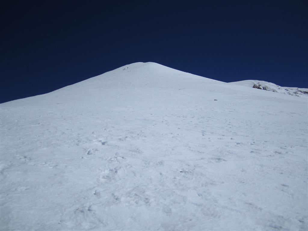 我緩慢而堅定地爬上了山頂。我事先從未看過路線圖,所以完全不知道之後會發生什麼事。山頂清晰可見,但距離還有一段距離,大約半英里,海拔300英尺。我在那裡休息了一會兒,讓自己冷靜下來。我的搭檔喬爾鼓勵我繼續前進,因為我們快到了。他很貼心地陪我等著,因為時間越長,雪就越軟,下山就越困難。