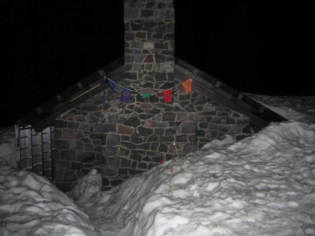 最終,我們看到了其他徒步者的頭燈。我們又回到了原路,但比預想的還要遠。我們計劃在馬營的避難所和泉眼處稍作停留,以便補充飲用水。我們不得不折返才能到達那裡。由於積雪過厚,只有屋頂露在外面,在黑暗中很難找到小屋。總而言之,迷路浪費了我們大約一個小時的時間。這聽起來可能不多,但當你面臨巨大的體力挑戰時,你當然希望盡可能有效率。在效率方面,我們的開局很糟糕。