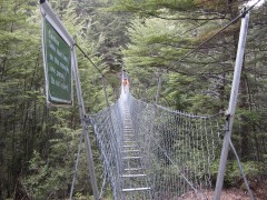 我正在過另一座吊橋。注意看牌子,上面寫著「一次過一座」。