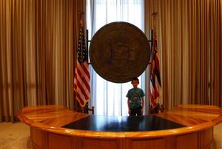 演講結束後,我在立法機構裡坐了大約五分鐘。一些議員在發表聲明,但大多數人看起來都很無聊。然後我搭電梯到五樓看了看,然後去了州長辦公室。那裡有一個供像我這樣的好奇遊客使用的門廳,還有一間可能是樣品屋的辦公室,裡面有一張大辦公桌和一些旗幟。