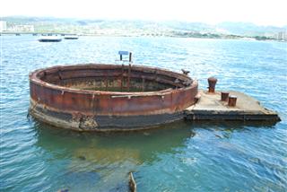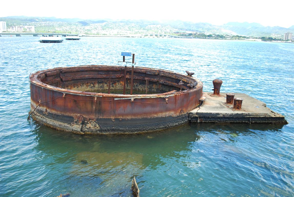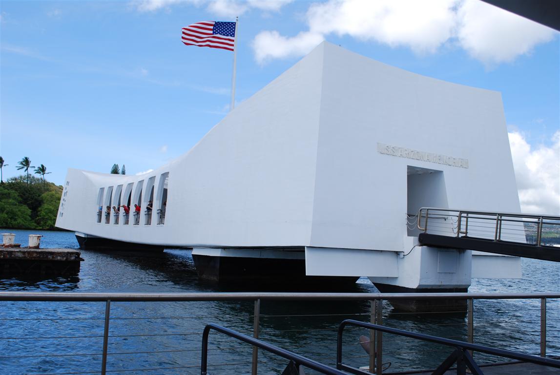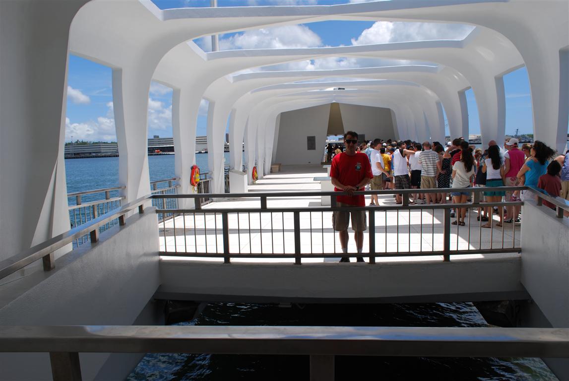 電影結束後,他們會默默地帶你搭渡輪,短暫的旅程後到達紀念碑。紀念碑矗立在沉沒的亞利桑那號戰艦上方,大部分船員仍安葬於其中。由於港口水深不深,戰艦的一些部件仍然露出水面。 PacificHistoricParks.org網站上有一張紀念碑和沈船的清晰俯視圖,可以讓你更了解當時的狀況。我跟兒子說,你仍然可以看到亞利桑那號漏油,就像你從我的照片裡看到的一樣。另一個遊客聽到了,假裝我沒聽見,對他的同伴說:“其實,那是柴油。”