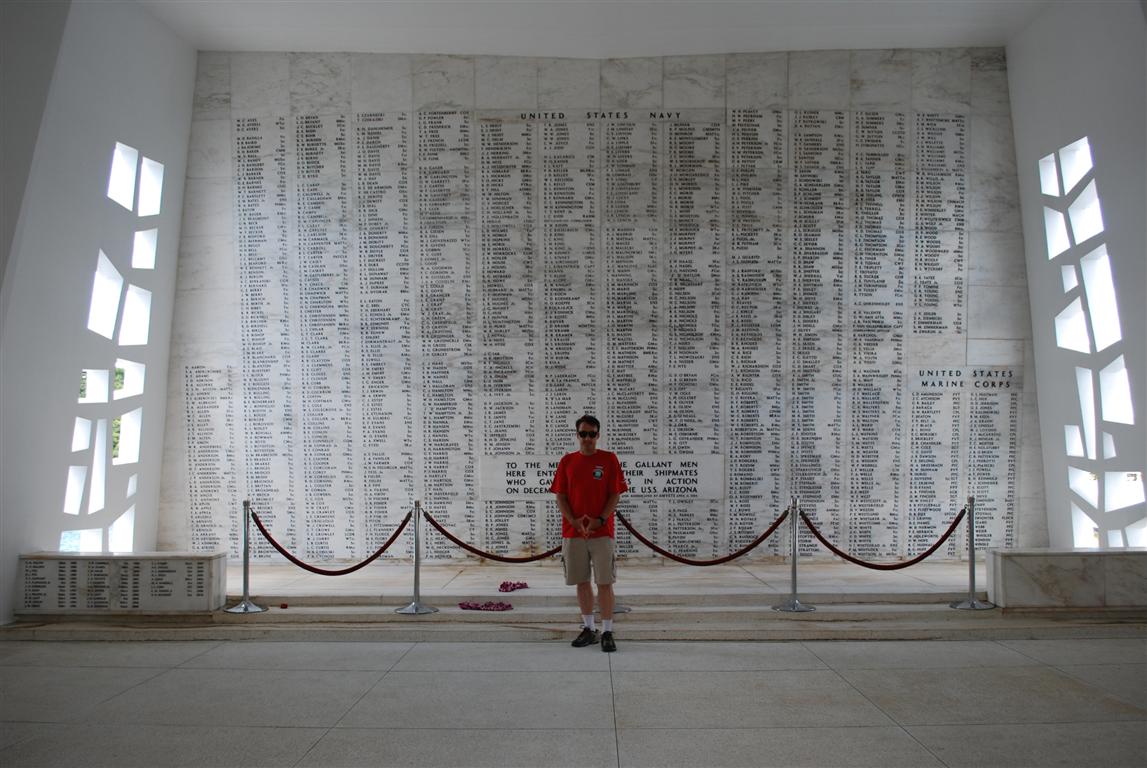 入口的另一端是一面牆,上面列著當天犧牲的1177名士兵的姓名。他們的平均年齡只有19歲。當天其他戰艦也沉沒了,但亞利桑那號的傷亡人數最多,也是僅有的兩艘未被打撈的戰艦之一,另一艘是猶他號。紀念碑的設計兩側高聳,象徵戰前戰後美國的力量和自豪感,中間凹陷,象徵戰爭本身。亞利桑那號仍然飄揚著美國國旗,國旗就在紀念碑旁的水面上飄揚。