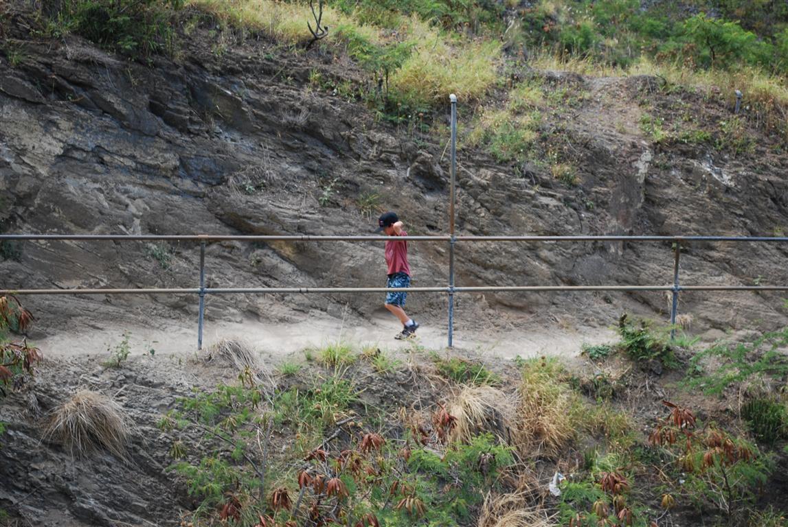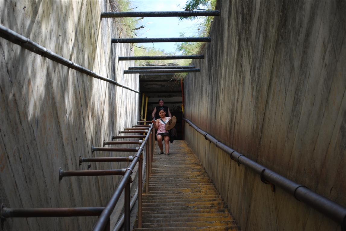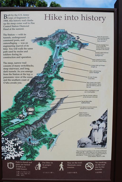 從那裡開始的路徑只有 3/4 英里,但海拔增加了 560 英尺。換句話說,它相當陡峭。這條路徑由陸軍工程兵團於 1908 年建造,作為防禦前哨。在第二次世界大戰中,它得到了加固。今天它向公眾開放,但它不是一條普通的路徑。它像大多數徒步旅行一樣,在火山口的側面蜿蜒而上。然而,當你接近頂部時,你會發現自己進入了一條長長的隧道。然後你又會在外面待一小段時間,接著是另一條隧道,這條隧道通往一座螺旋樓梯,可以帶你上三層掩體。我的書上說要帶手電筒,但隧道和樓梯都亮著燈。最後,你必須蹲下才能再次回到外面,在那裡你會欣賞到檀香山和瓦胡島西南部的壯麗景色。