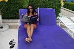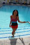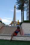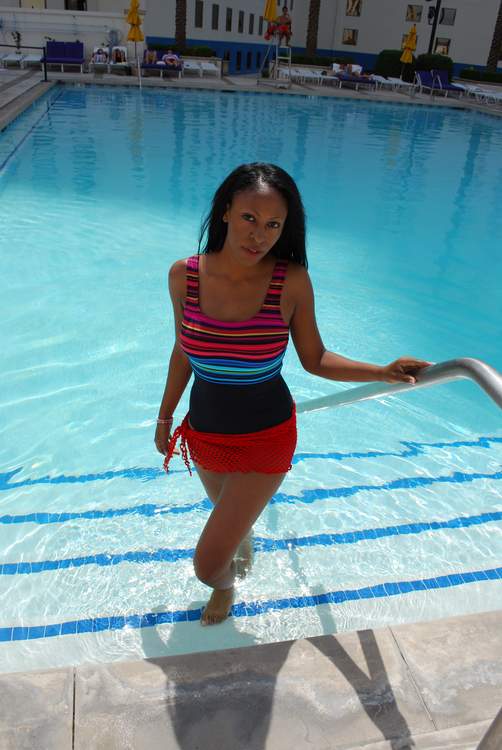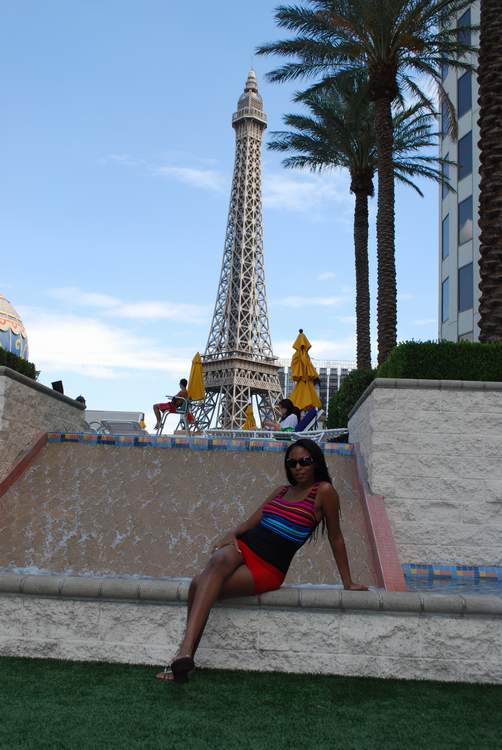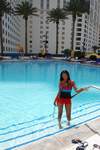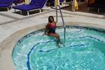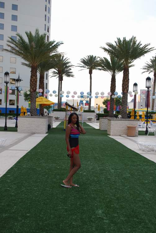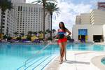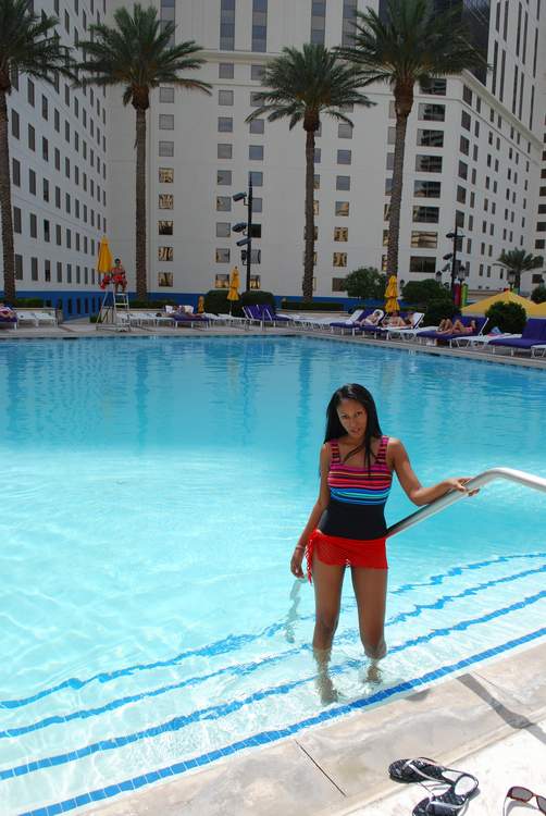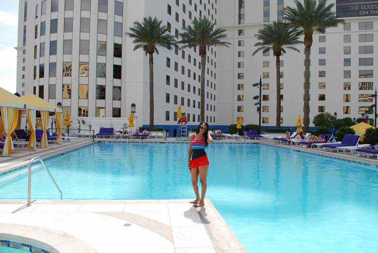 對於拉斯維加斯大道上的賭場來說,我得給好萊塢星球賭場的泳池打個低分。賭場六樓的屋頂上有兩個泳池。兩個泳池之間是一大片空地。泳池很普通,幾乎沒有綠植或特別設施。熱水浴缸外掛著「僅限VIP」的牌子,但包括我和Nikkia(見下圖)在內的所有人都偷偷溜了過去。餐廳