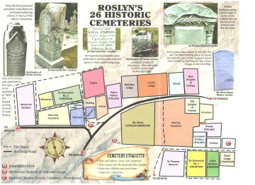 在最後一集中,他們展示了鎮上的墓地,看起來很小。然而,羅斯林實際上有26個墓地,主要依種族隔離。我在商店遇到的一位先生說,飾演露絲安米勒的佩格菲利普斯(http://en.wikipedia.org/wiki/Peg_Phillips)就埋葬在其中一座墓園裡。我試著找她的墳墓,但這26個墓園之間墓碑太多,我得花一整天的時間反覆摸索才能找到。