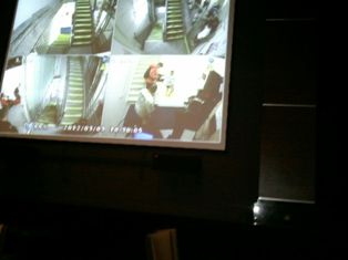 主辦單位還在展廳設立了一個觀景區,方便攀岩者的家人和朋友觀看比賽的進行。在起點、終點和兩個緊急平台上分別安裝了四台攝影機,將攀岩者在樓梯間的即時視訊傳輸到大螢幕上。 KM的岳母在KM衝過終點線時拍下了這張模糊的照片。