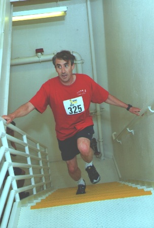 不管樓層數是多少,我最初的興奮最後還是消退了。女士們叫我「60秒奇蹟」可不是浪得虛名。這時,我不得不放慢腳步,一步一腳印,走得更像快走。最終,我恢復了鎮定,加快了步伐,但速度遠不及剛開始。我發現一個適合自己的步調是,每隔一層樓梯輪流跳樓梯,並盡量保持穩定但快速的步行速度。在這段時間裡,我超過了其他幾個爬樓梯的人。我是個好勝心強的傢伙,總是喜歡在任何事情上打敗別人。
