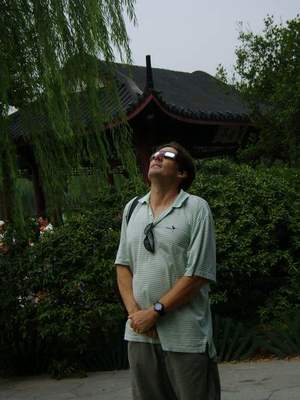 然後太陽就下山了。天空突然一片漆黑,路燈也亮了起來。人群中一片寂靜。正如任何日食照片所顯示的那樣,月亮周圍出現了一種光暈。我可以清楚地看到一顆行星,如果不是潮濕的霧霾和中國無處不在的空氣污染,我或許還能看到一些星星。日食期間可見的星星通常要等六個月才能看到,那時地球位於其繞太陽公轉軌道的另一側。此時,文字和圖片都無法捕捉那一刻的瞬間。只有親身體驗才能體會到它真正的滋味。或許對我來說,這一刻更重要,因為我經歷了幾十年的規劃和期待。