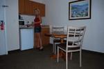 我星期三晚上住在那裡,房費是39美元,外加12%的內華達州房稅(稅率剛剛漲)。飯店前台無需等待。我被告知第二晚只需22美元。我忘了帶捲尺,但房間大約是普通飯店房間的兩倍大。我的基本房配備了廚房、桌子、沙發、床和大浴室。