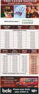 然而,事實證明這完全沒有必要。從維多利亞市中心到皇家景觀酒店 (View Royal) 非常方便。維多利亞內港遊客中心友善的工作人員給了我一本賭場的宣傳冊和免費接駁車的時間表。接駁車每 90 分鐘一班,在維多利亞市中心停靠六站,包括皇家博物館。