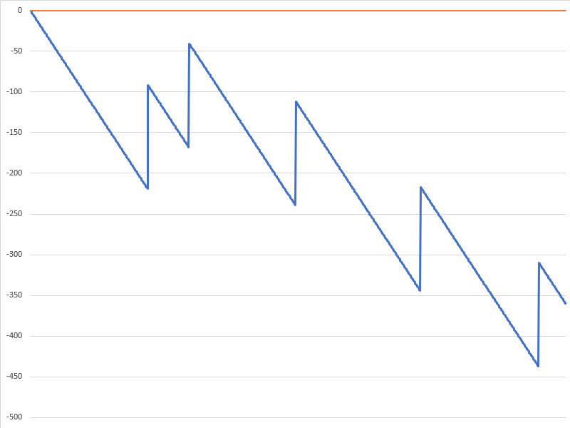 下表展示了我針對數十億場反馬丁格爾遊戲,在不同遊戲、投注和獲勝目標下進行的模擬結果。獲勝目標包含原始單位投注。負整數顯示在括號中。在這些模擬中,遊戲結束時要麼輸掉一個單位,要麼達到獲勝目標。