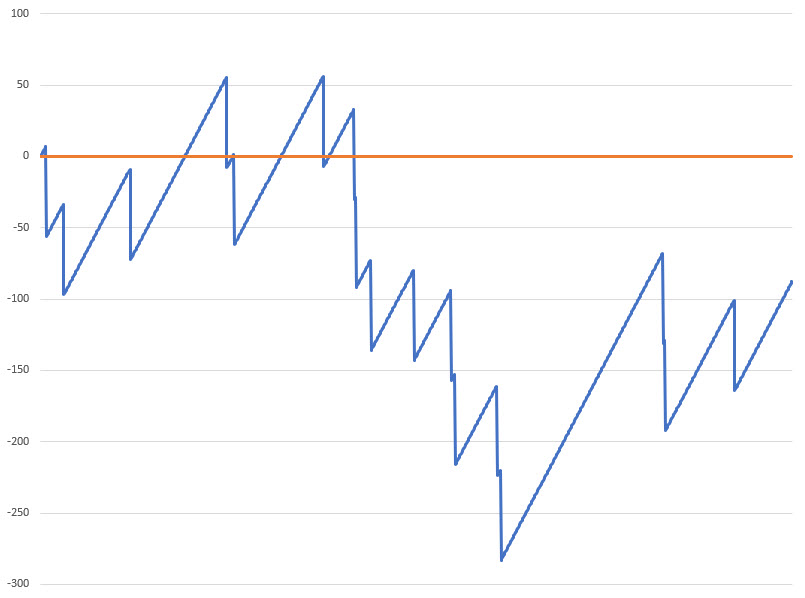 讓我們來看看玩家連續六次輸掉賭注的情況。這意味著玩家的資金需要達到獲勝目標的63倍。達到一個單位的獲勝目標的機率是98.3051%。如果玩家重複這樣做,那麼他平均每輸掉63個單位的賭注,就能預期贏取58.000094個賭注。需要注意的是,63個單位的損失大於兩次輸掉之間58次贏利的次數。最後,如果玩家不斷重複此操作,直到他的資金翻倍(每次翻倍一個單位)或輸光為止,那麼他翻倍資金的機率是34.0634%。