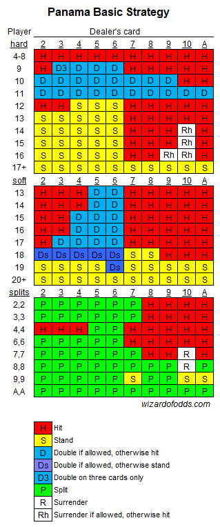 這些規則下的賭場優勢非常低,在連續洗牌機上為0.12%,在非連續洗牌機上為0.14%。本文將介紹巴拿馬規則下的基本策略。以下是巴拿馬規則下的基本策略。
