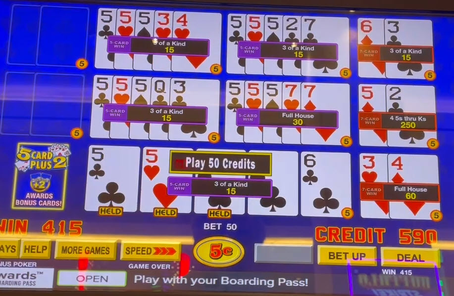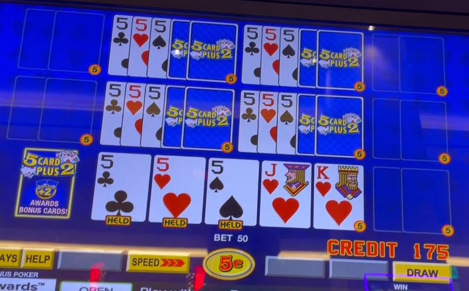 2024年10月,我在拉斯維加斯杜蘭戈賭場發現了「5 Card Plus 2」遊戲。和許多視訊撲克遊戲一樣,它是多人遊戲的附加功能。玩家必須加倍下注才能有機會獲得額外的兩張牌。