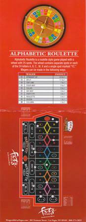 字母輪盤是我2011年8月7日在拉斯維加斯菲茨傑拉德酒店看到的輪盤變體。它是一種簡單的輪盤變體,包含顏色和字母。輪盤共有25個空格,每個空格代表A到X的每個字母,Y和Z也各佔一個空格。此外,還有六種顏色,每種顏色由四個字母組成。 YZ的處理方式與單零輪盤中的0類似,沒有顏色。